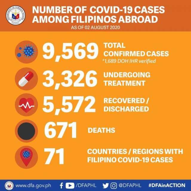 (Eagle News) — COVID-19 cases among overseas Filipinos have reached 9569 after 13 more cases were confirmed from the Asia and the Pacific.