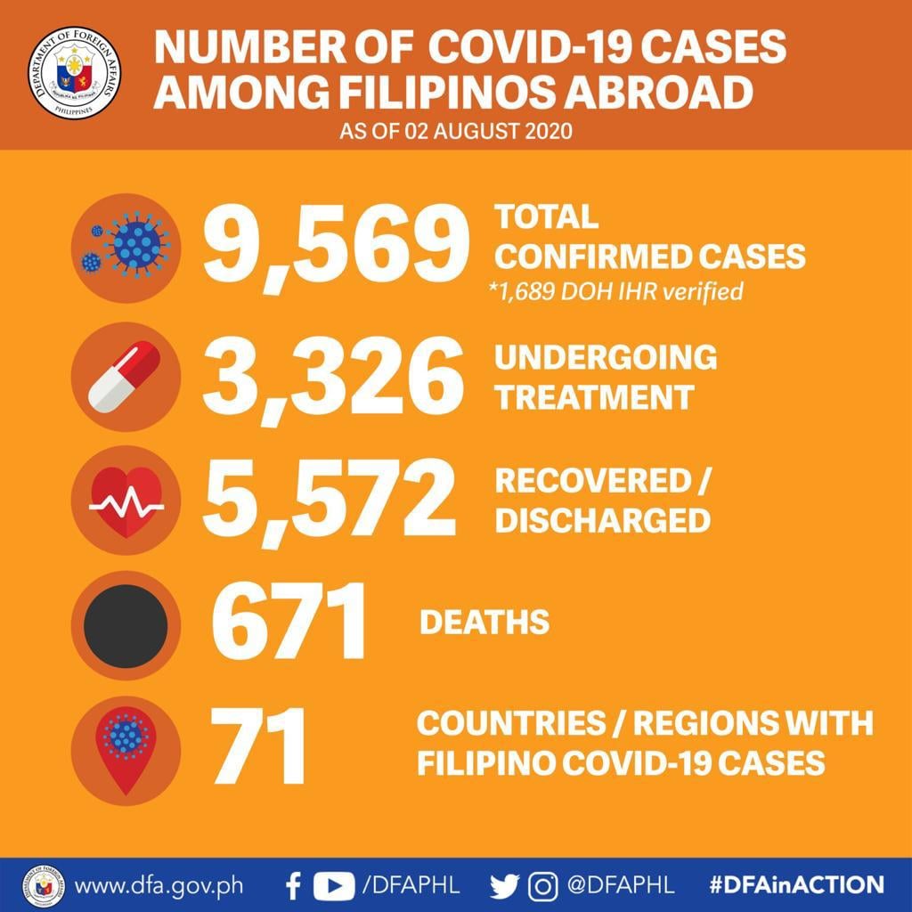 (Eagle News) — COVID-19 cases among overseas Filipinos have reached 9569 after 13 more cases were confirmed from the Asia and the Pacific.