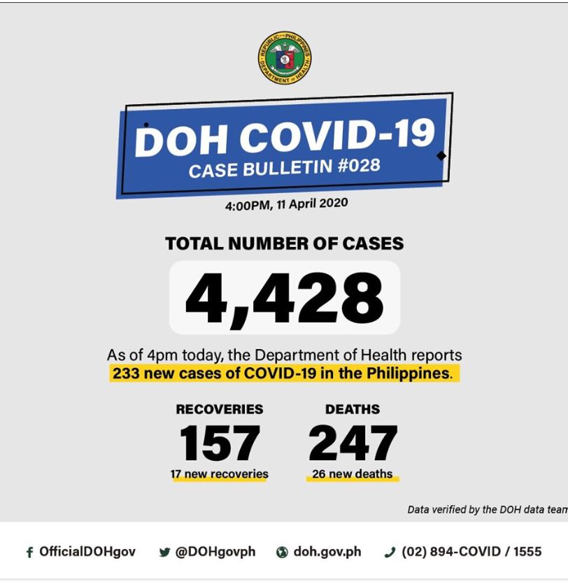 (Eagle News) – Coronavirus cases in the country continued to increase, rising to 4,428 with the addition of 233 new cases, the Department of Health (DOH) said on Saturday, April 11, 2020.