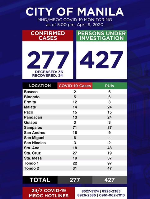 (Eagle News) – The Manila Health Department (MHD) reported five new cases of coronavirus in the city, bringing the total number of cases to 277, as of April 9.