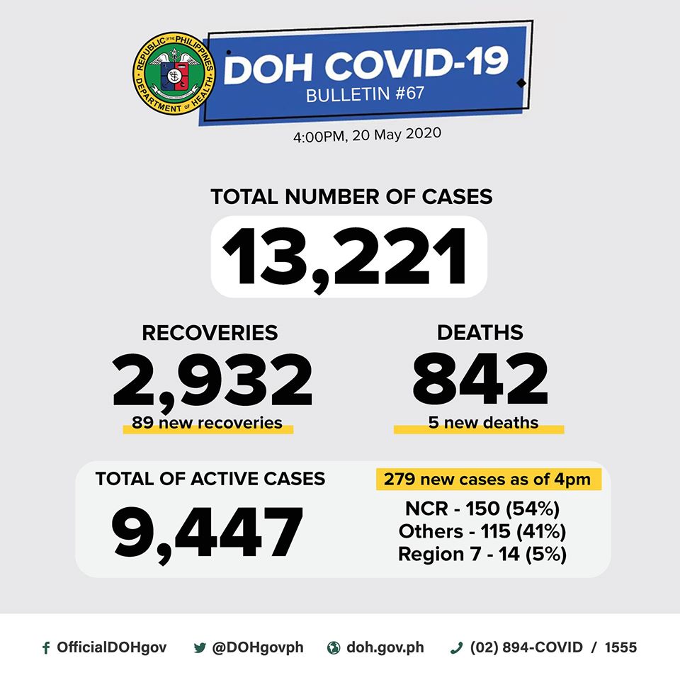 The Department of Health on Wednesday, May 20, said of the 279 new cases, 54 percent or 150 came from the National Capital Region; 41 percent or 115 cases from other areas; and five percent or 14 cases from Region 7.