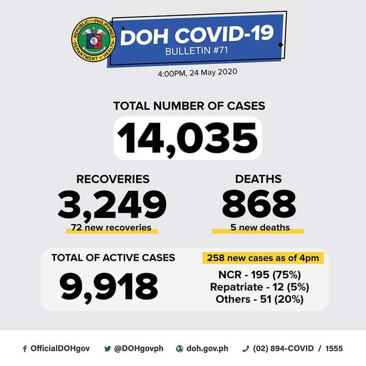(Eagle News)–The number of coronavirus disease 2019 cases in the country has reached 14035 after the Department of Health reported 258 additional cases.