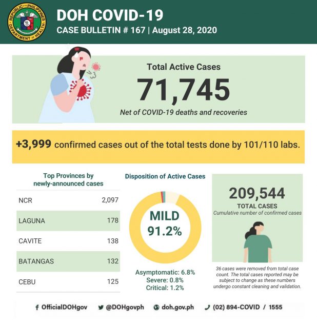 (Eagle News) — The number of COVID-19 cases in the country breached the 209,000 mark on Friday, Aug. 28, after the Department of Health reported 3,999 additional cases.