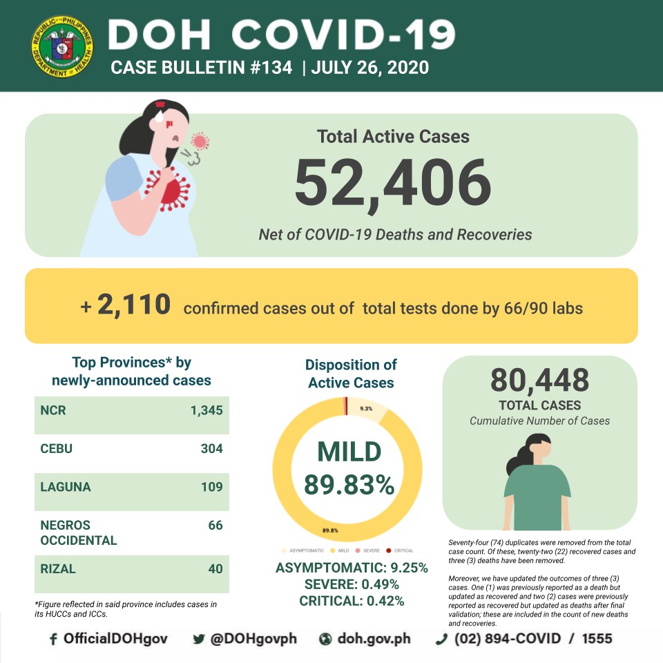 (Eagle News) — The number of coronavirus disease 2019 cases in the country breached the 80,000 mark on Sunday, July 26, after the Department of Health reported 2110 cases on the same day.