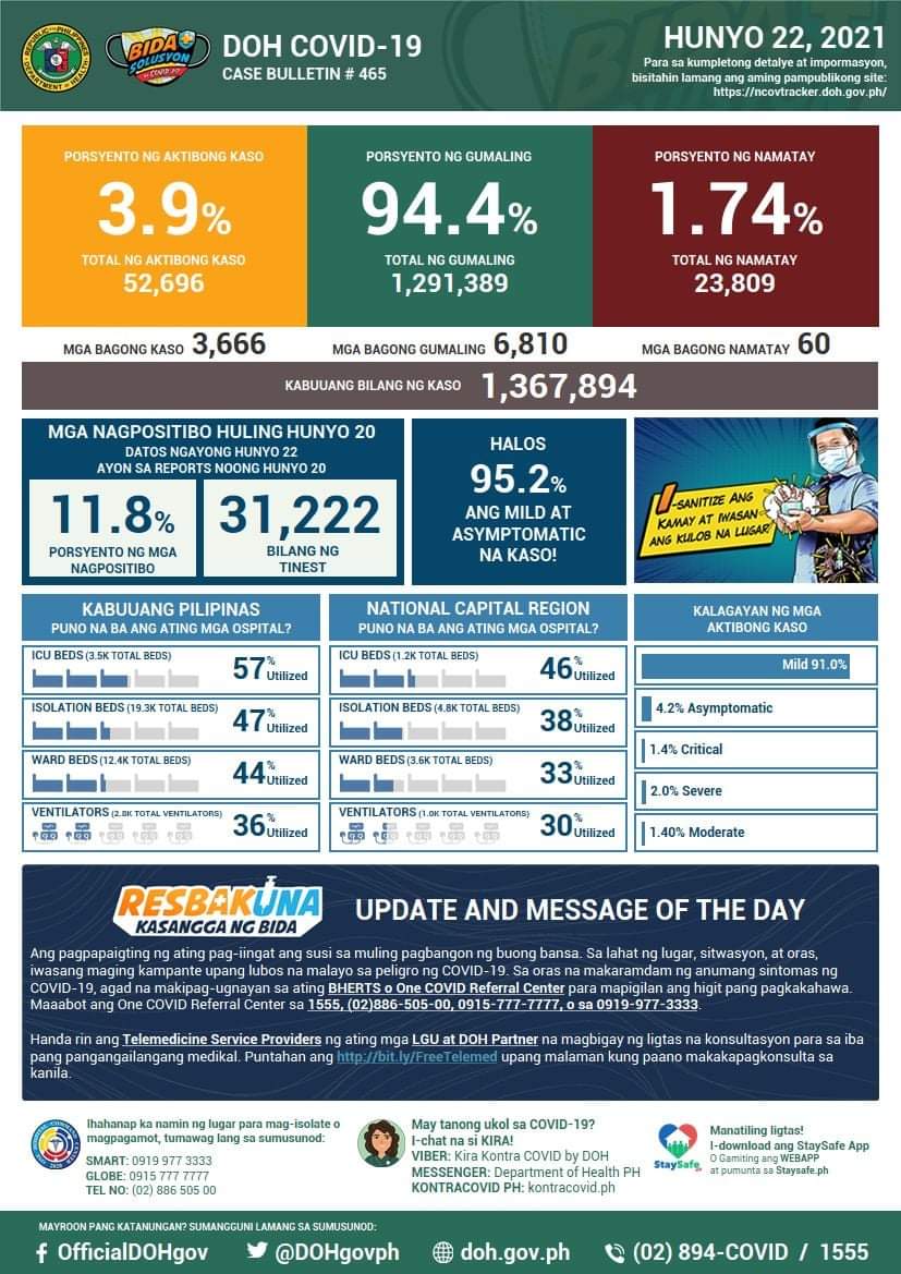 (Eagle News)–COVID-19 cases in the Philippines reached 1367894 on Tuesday, June 22, after the Department of Health reported 3666 additional cases.