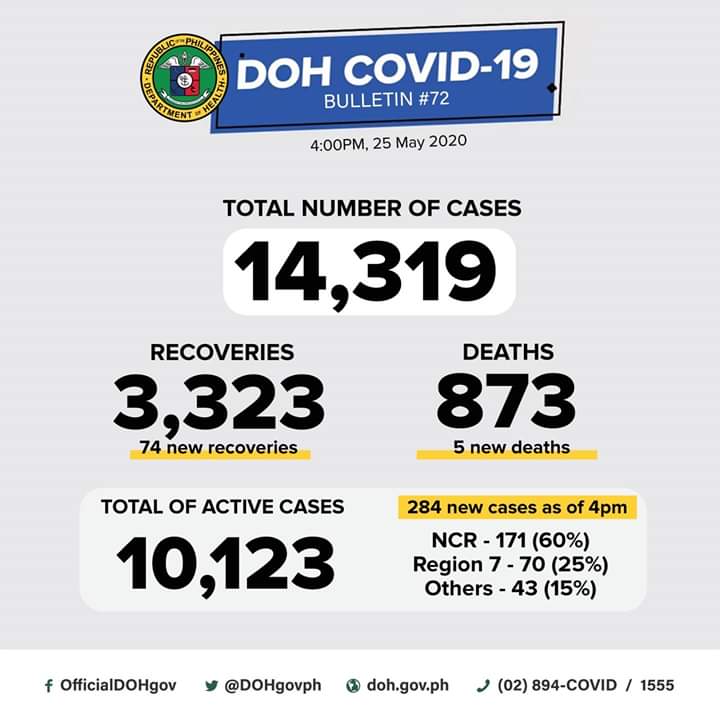 (Eagle News)–The number of coronavirus disease 2019 cases in the country climbed to 14319 on Monday, May 25, with the addition of 284 cases.