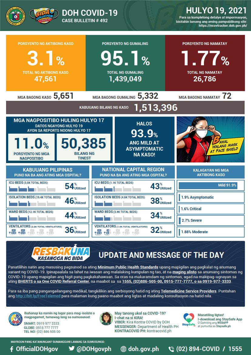 (Eagle News) — COVID-19 cases in the Philippines climbed to 1,513,396 on Monday, July 19, after the Department of Health reported 5,651 additional cases.