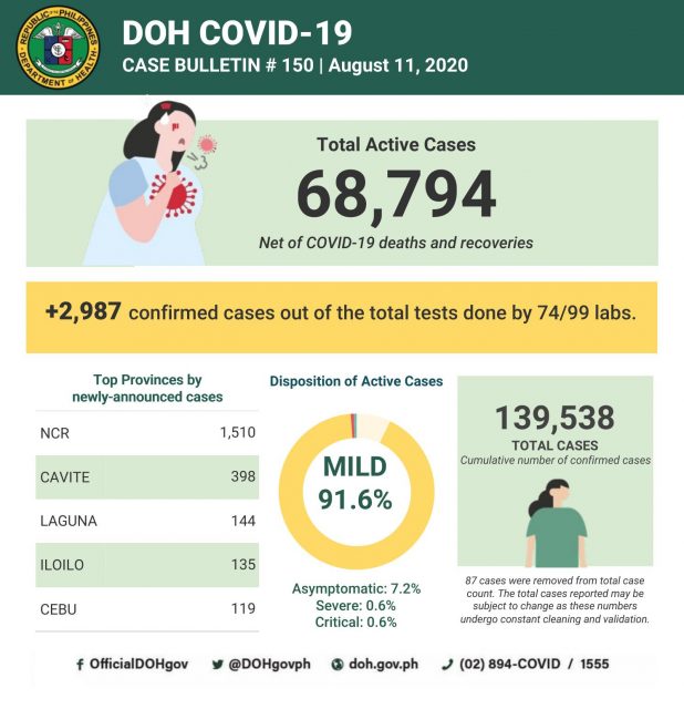 (Eagle News) — The number of coronavirus disease 2019 cases in the country reached 139,538 on Tuesday, Aug. 11, after the Department of Health reported 2987 cases.