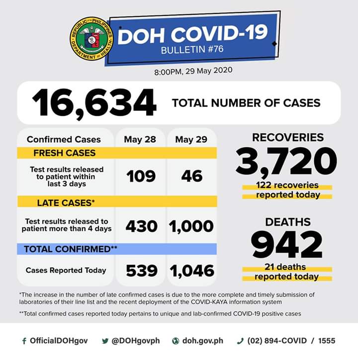 (Eagle News)–The number of coronavirus disease 2019 cases in the country has breached the 16000 mark and is now at 16634 after the Department of Health reported on Friday night 1046 cases.