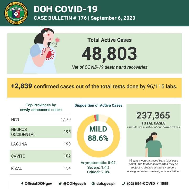 (Eagle News)–COVID-19 cases in the country breached the 237,000 mark on Sunday, Sept. 6, after the Department of Health reported 2839 additional cases.