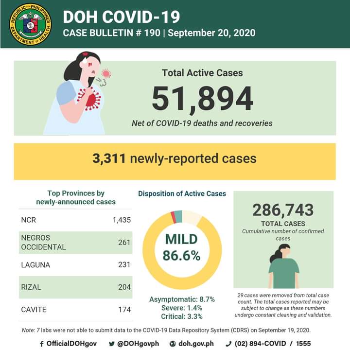 (Eagle News)–COVID-19 cases in the country breached the 286,000 mark on Sunday, Sept. 20, after the Department of Health reported an additional 3311 cases.