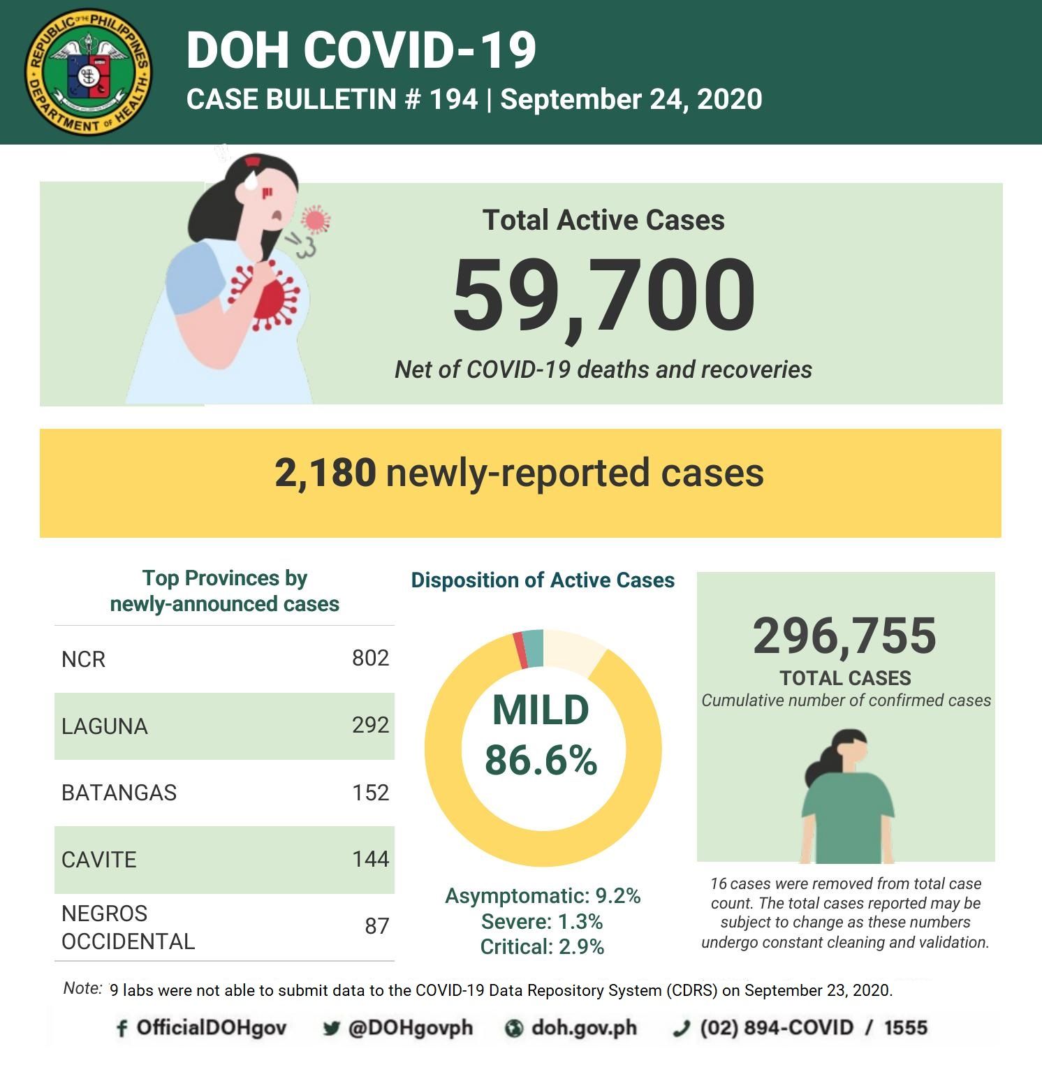 (Eagle News) — COVID-19 cases in the country breached the 296,000 mark on Thursday, Sept. 24, after the Department of Health reported additional 2180 cases.