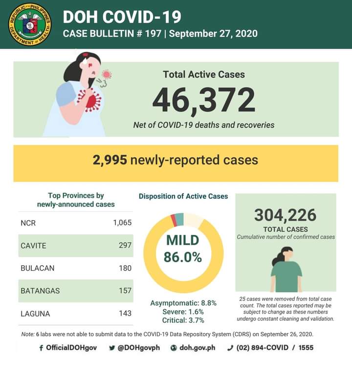 (Eagle News)–COVID-19 cases in the country breached the 304,000 mark on Sunday, Sept. 27, after the Department of Health reported additional 2995 cases.