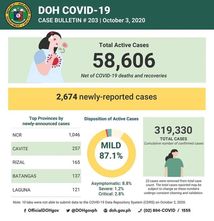 (Eagle News)–COVID-19 cases in the country reached 319,330 on Saturday, Oct. 3, after the Department of Health reported 2674 new cases.
