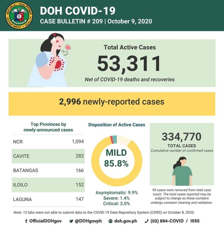 (Eagle News)–COVID-19 cases in the country breached the 334,000 mark on Friday, Oct. 8, after the DOH reported additional 2,996 cases.
