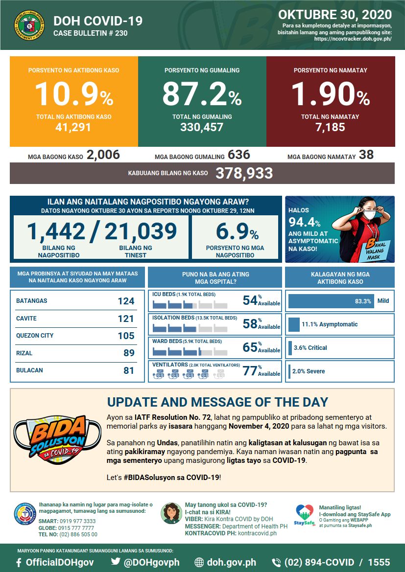 (Eagle News) — COVID-19 cases in the country breached the 378,000 mark on Friday, Oct. 30, after the Department of Health reported 2006 more cases.