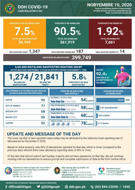 (Eagle News) — COVID-19 cases in the country breached the 399,000 mark on Tuesday, Nov. 10, after the Department of Health reported 1347 additional cases.