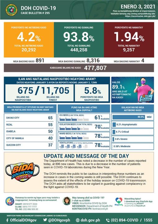 (Eagle News) — COVID-19 cases in the country breached the 477,000 mark on Sunday, January 3, after the Department of Health reported 891 additional cases.