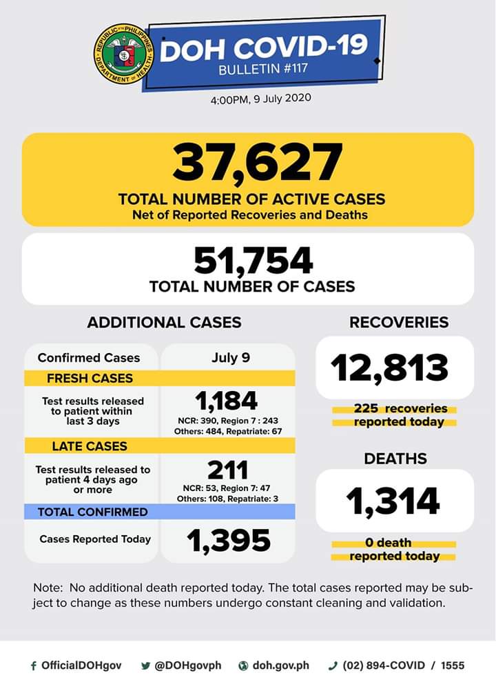 Of the 1184 fresh cases, 390 came from Metro Manila, 243 from Region 7, 484 from other areas, and 67 were repatriates.