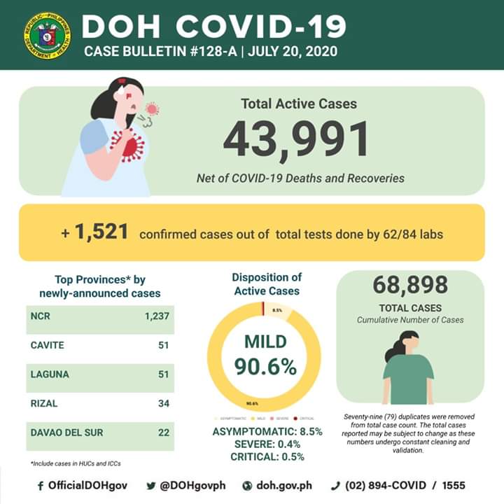 (Eagle News)–The number of coronavirus disease 2019 cases in the country breached the 68,000 mark after the Department of Health reported 1521 cases on Monday, July 20.