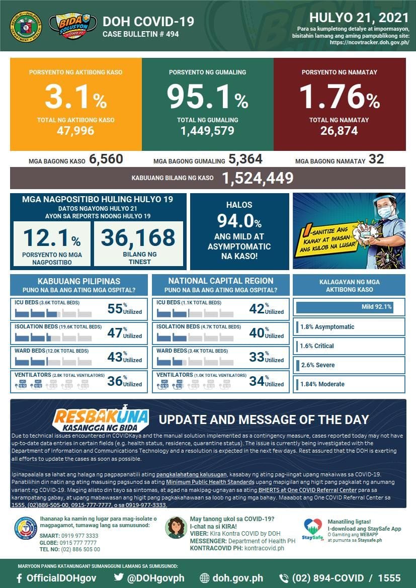 (Eagle News) — COVID-19 cases in the Philippines are now at 1524449 after the Department of Health reported 6560 additional cases.