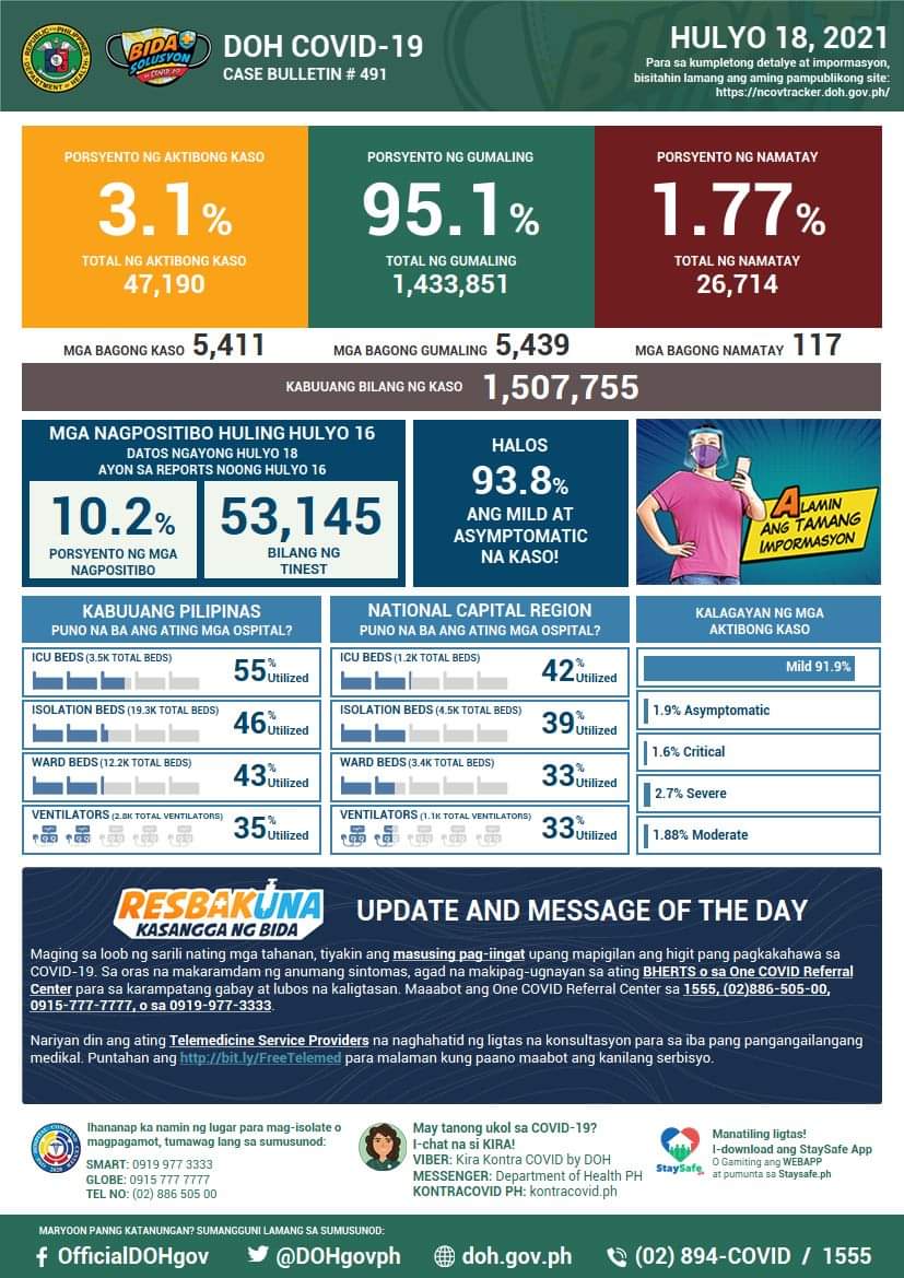 (Eagle News)–Detected COVID-19 cases in the Philippines are now at 1507755 after the Department of Health reported 5411 additional cases.