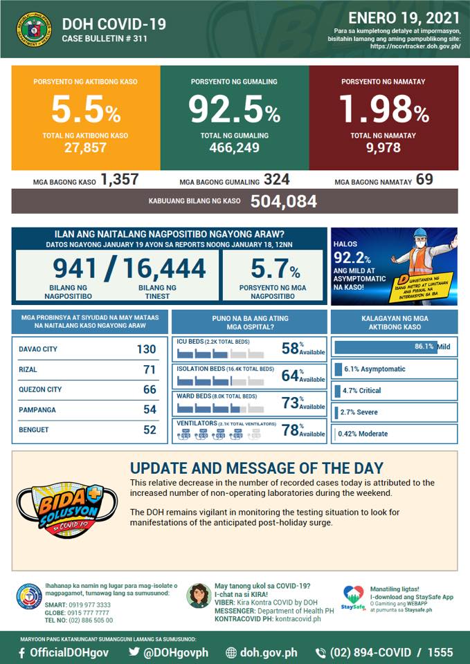 (Eagle News) — The number of COVID-19 cases in the country climbed to 504,084 after the Department of Health reported 1357 additional cases on Tuesday, January 19.