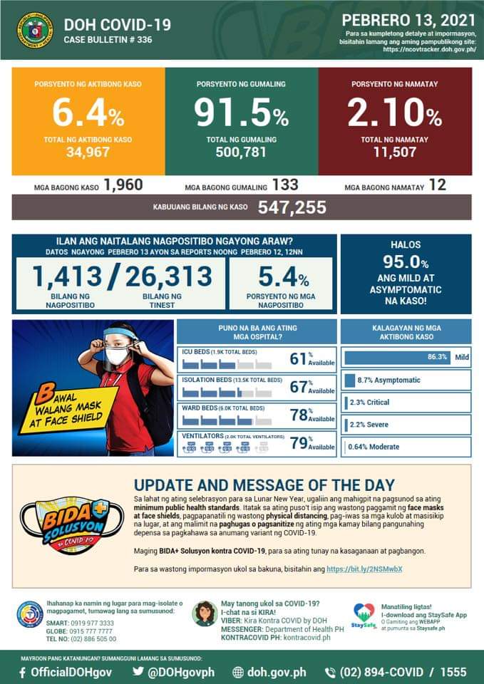 (Eagle News)–COVID-19 cases in the Philippines climbed to 547255 after the Department of Health reported 1960 additional cases.