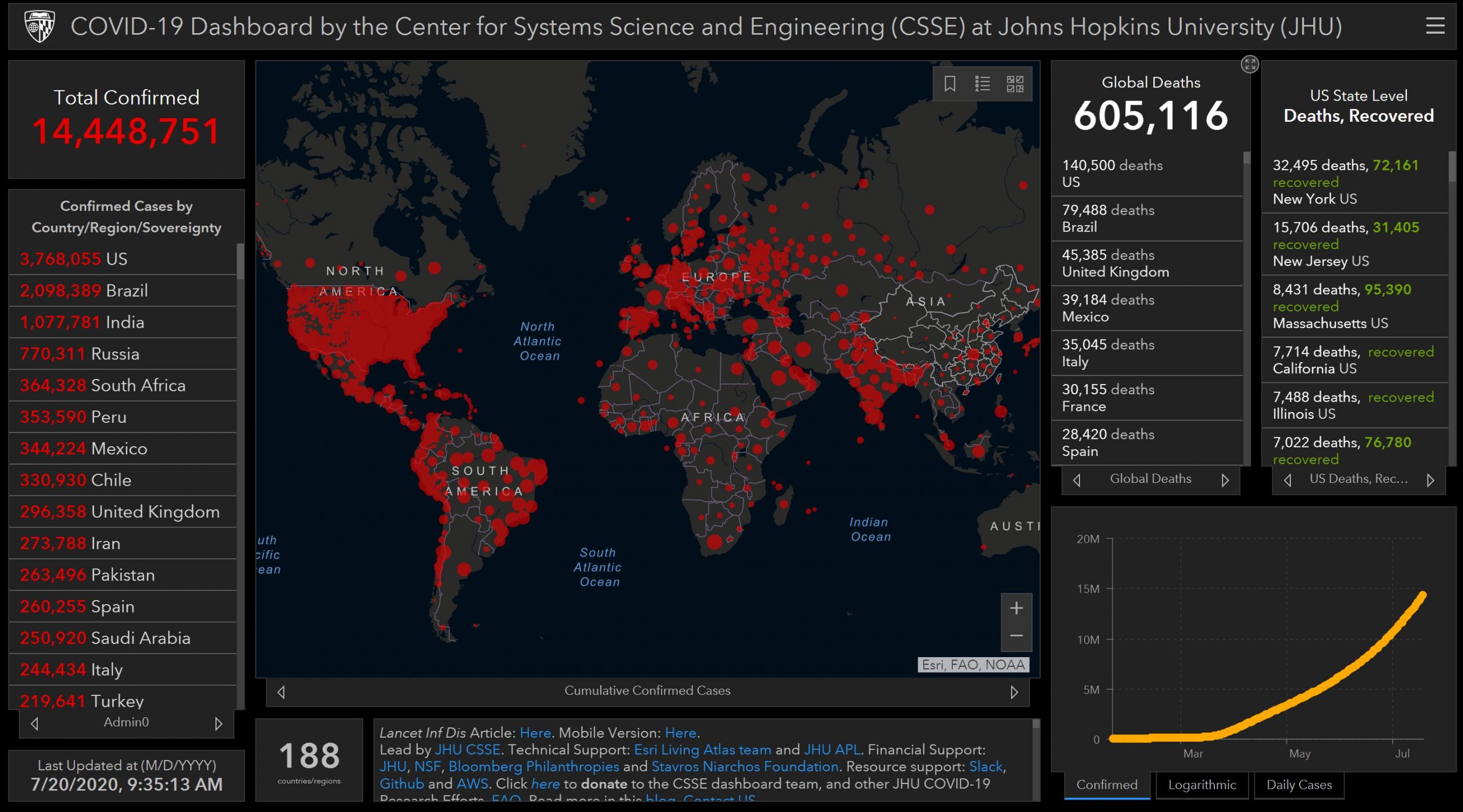 (Eagle News) – The number of confirmed COVID-19 cases worldwide has reached more than 14.4 million, while deaths due to the virus have surpassed 605,000, according to Johns Hopkins University on Monday, July 20.