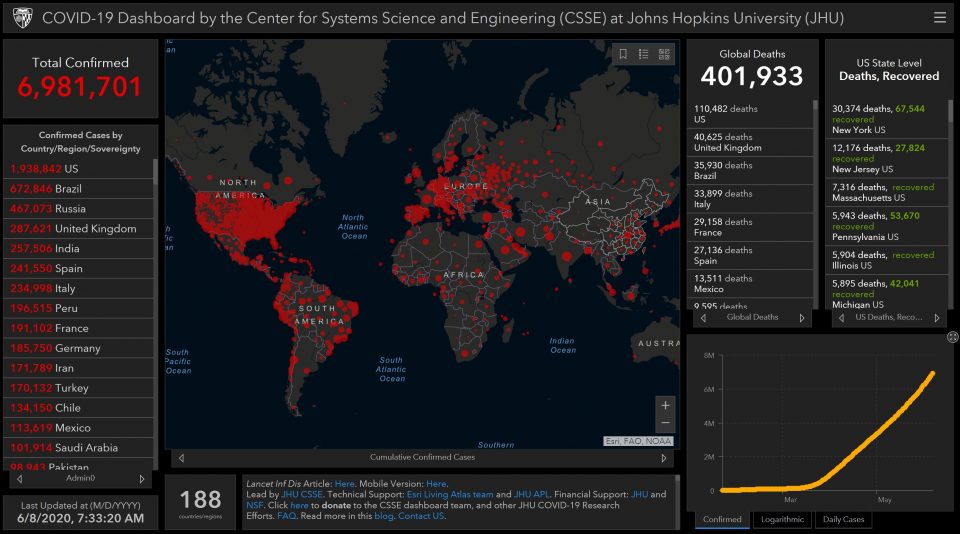 Screengrab of global COVID-19 cases in the virus dashboard of Johns Hopkins University (JHU) as of 7:30 a.m., Monday, June 8, 2020 /Courtesy Johns Hopkins University.