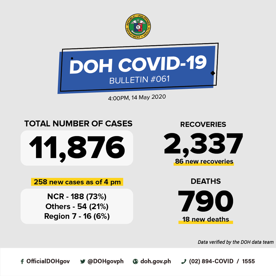 (Eagle News) — The number of coronavirus disease 2019 cases in the country has reached 11876, after the Department of Health reported 258 additional ones on Thursday, May 14.