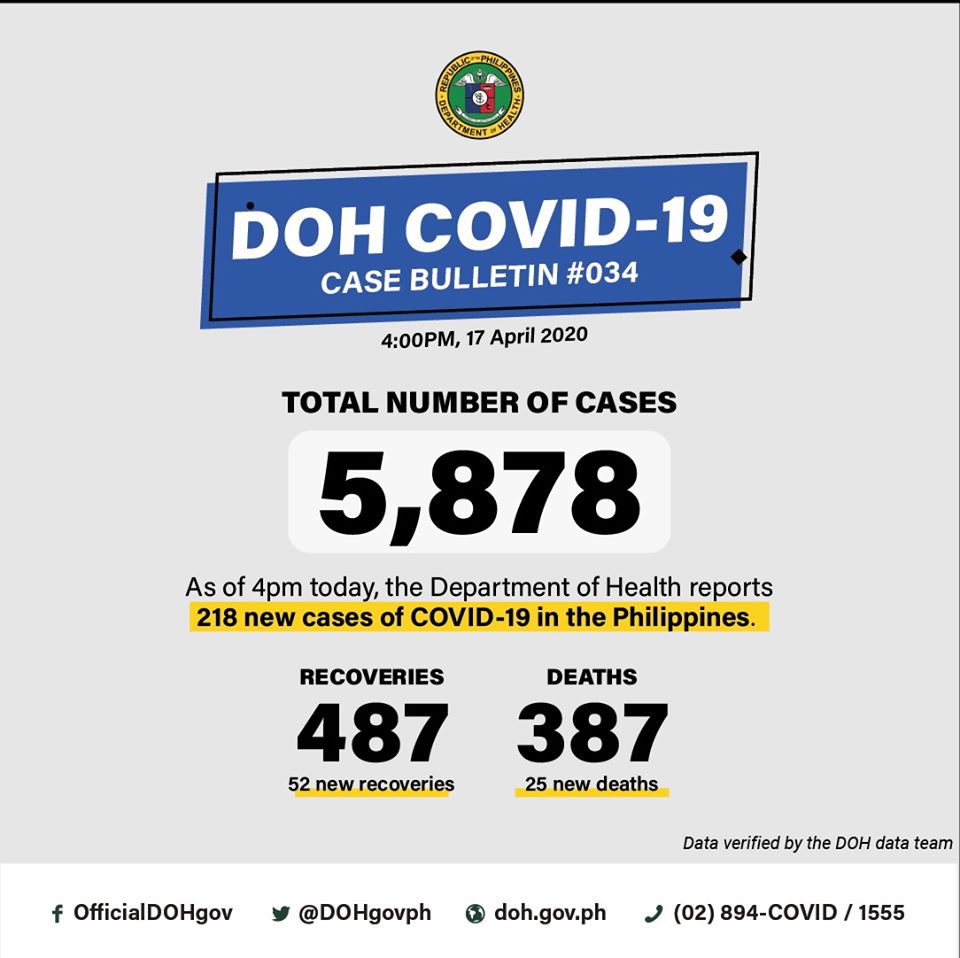 (Eagle News) –COVID-19 recoveries in the country widened their lead over deaths even as the Philippines confirmed 218 new COVID-19 cases, for a total of 5878 cases.