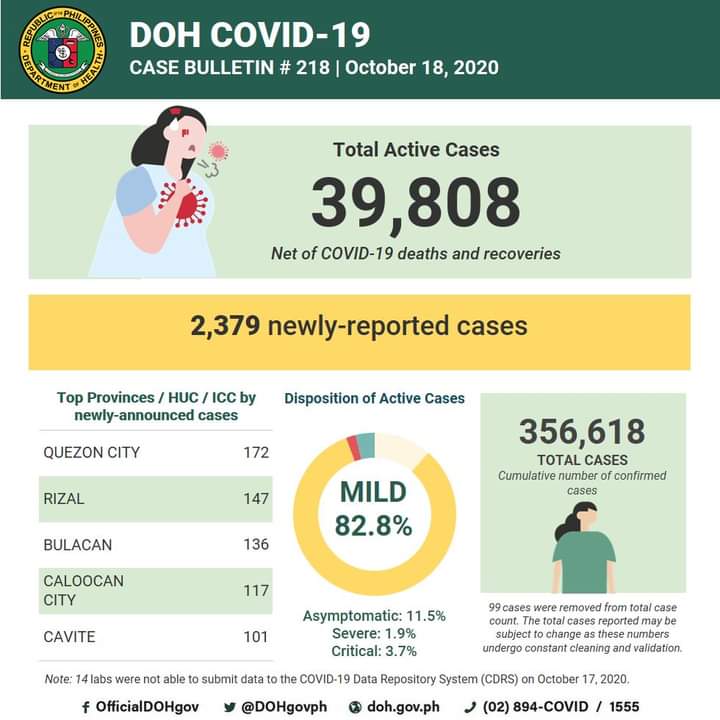 (Eagle News)–The COVID-19 tally in the Philippines reached 356618 on Sunday, Oct. 18, after the Department of Health reported 2379 additional cases.