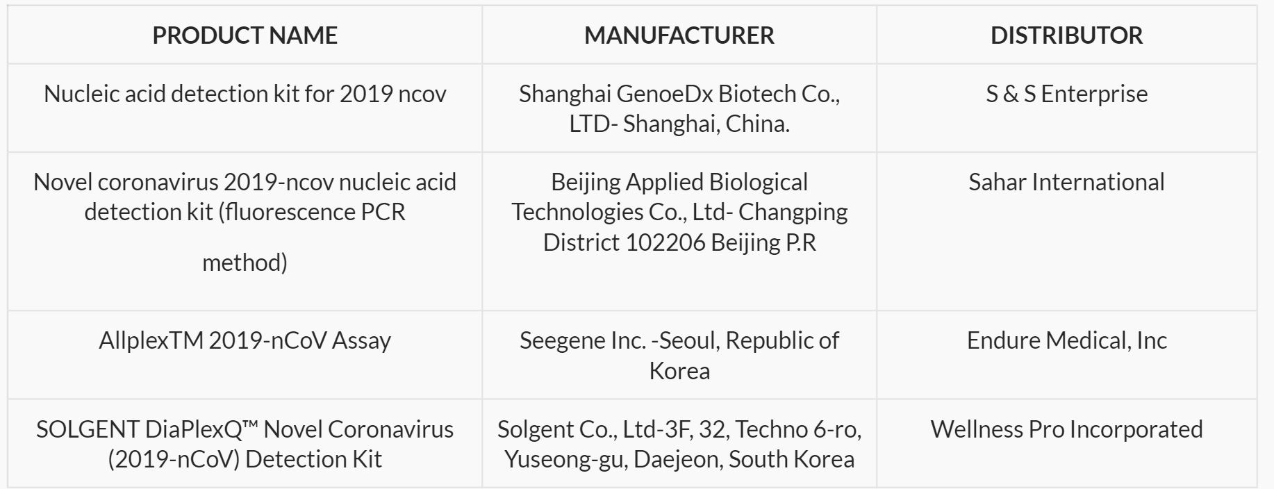 The appoved COVID-19 test kits include the Nucleic acid detection kit for 2019 nCov from Shanghai, China; the Novel coronavirus 2019-ncov nucleic acid detection kit (fluorescence PCR method) from Beijing; and the AllplexTM 2019-nCoV Assay and SOLGENT DiaPlexQ™ Novel Coronavirus (2019-nCoV) Detection Kit, both from South Korea.
