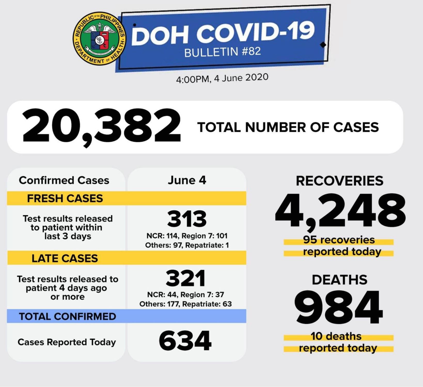 (Eagle News) — The number of coronavirus cases in the Philippines reached 20,382 after 634 cases were added on Thursday, June 4, according to the Department of Health.