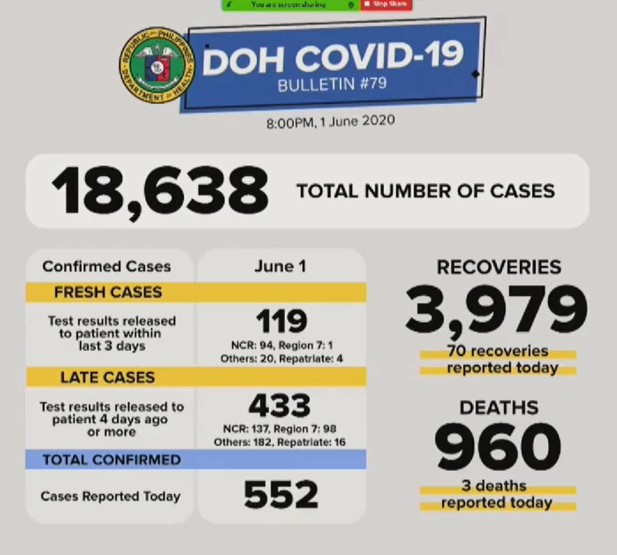 (Eagle News) – The Department of Health announced declining deaths in the past few weeks as it reported 552 COVID-19 cases on Monday, June 1, bringing the total coronavirus cases in the country to 18,638.