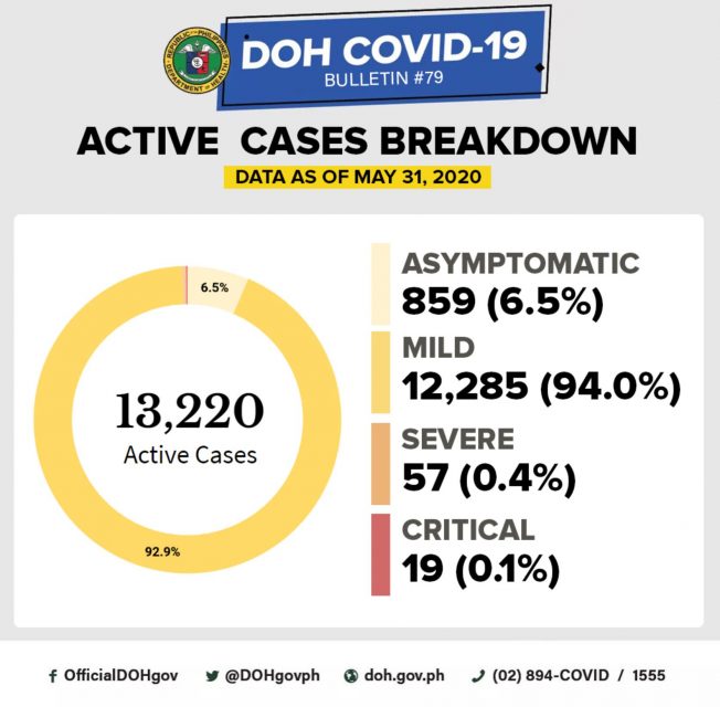 More than 90 percent of the COVID-19 cases in the country are also mild, while only 6.5 percent are symptomatic. Less than 1 percent, or just 0.5 percent are severe or critical cases, as of May 31, 2020 data.