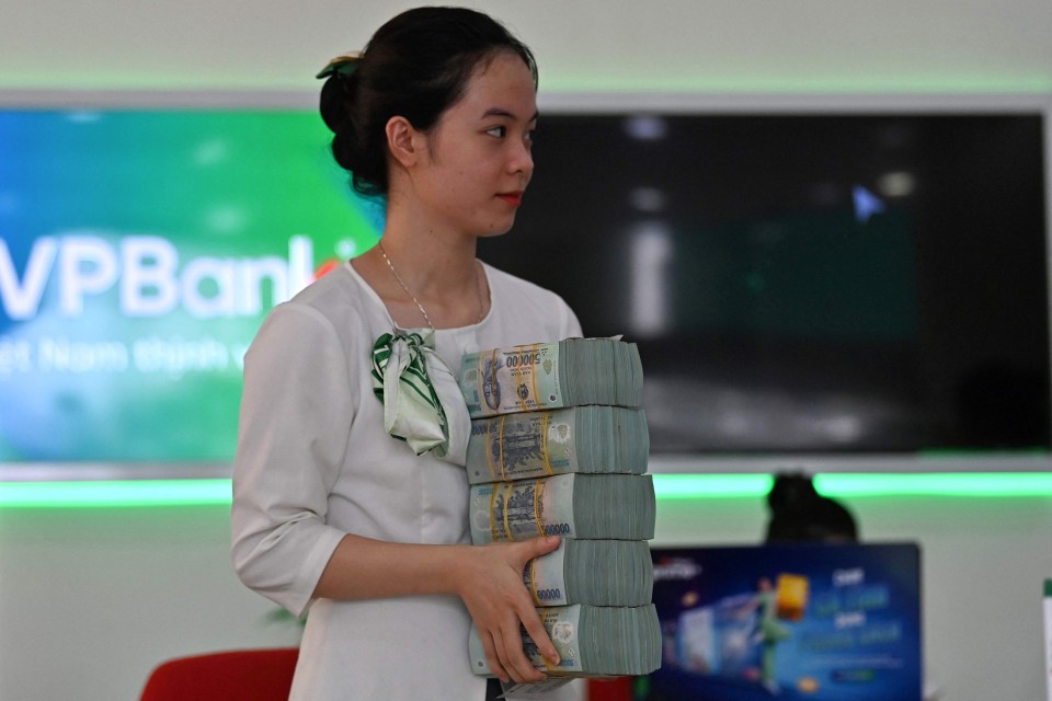 A bank employee carries stacks of currency notes at a branch of VPBank in Hanoi on June 29, 2023. Vietnam’s economic growth slowed in the first half of the year as exports were hit by a slump in demand, authorities said June 29. (Photo by Nhac NGUYEN / AFP)