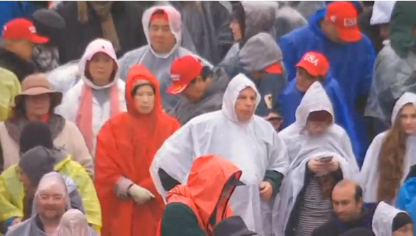 Checkpoints around the National Mall in front of the Capitol opened early to begin admitting guests, some of them wearing red caps bearing Trump’s “Make America Great Again” slogan. They were barred from bringing selfie sticks, coolers for beverages, and long umbrellas despite the rainy weather.