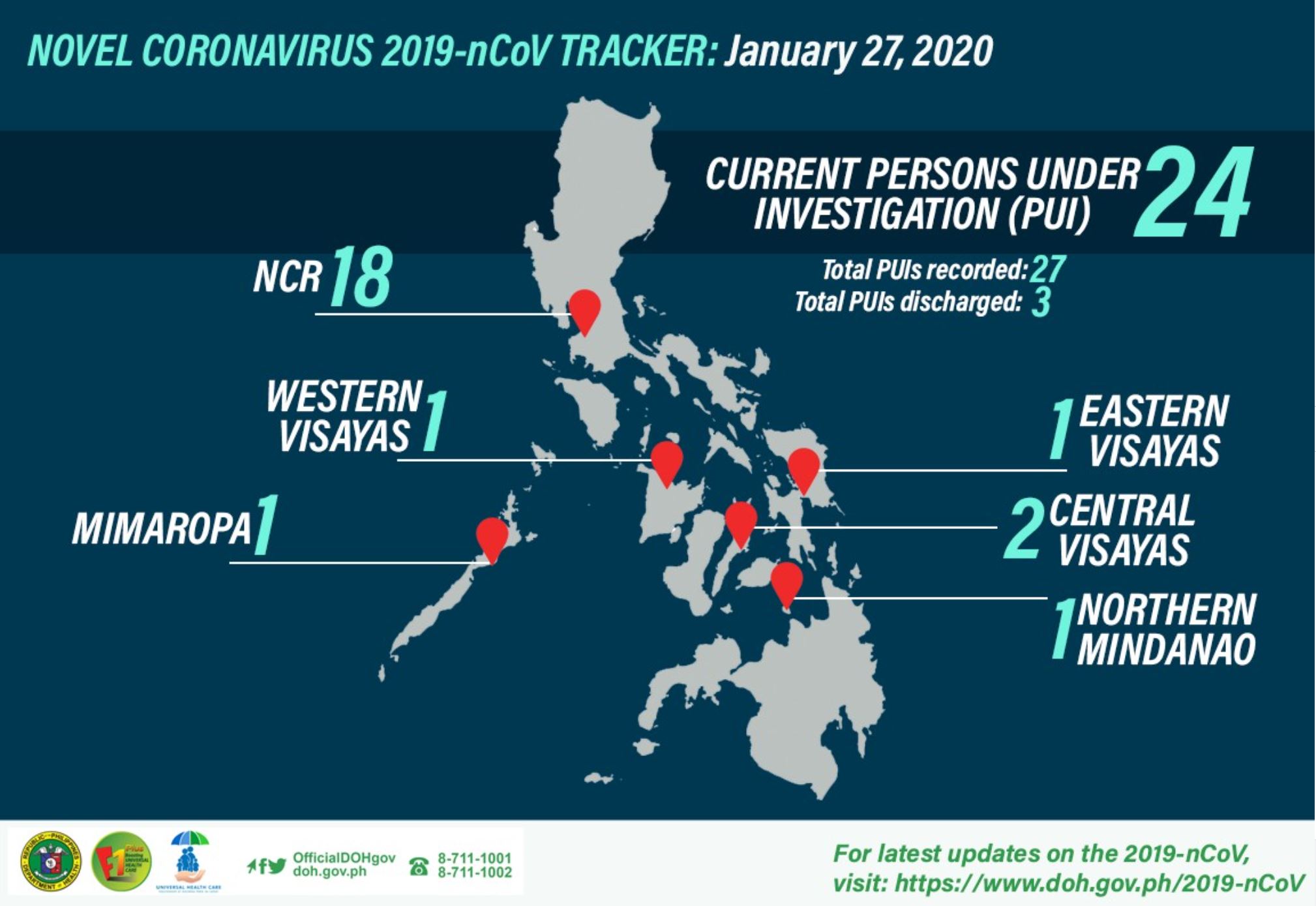 “So we now have a total of 27 persons under investigation (PUIs) all over the Philippines,” said Domingo.