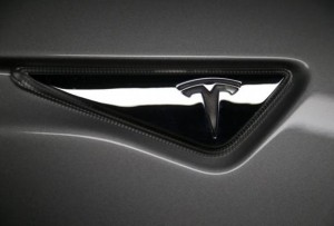 The logo is seen on a new all-wheel-drive version of the Tesla Model S car in Hawthorne, California October 9, 2014. REUTERS/Lucy Nicholson