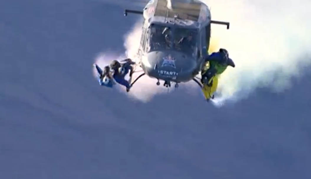 40 athletes from 18 countries leapt from a helicopter 8,000 feet (2,440 metres) above the desert in four-person heats before slaloming through mid-air gates in the sky at speeds of up to 160mph.