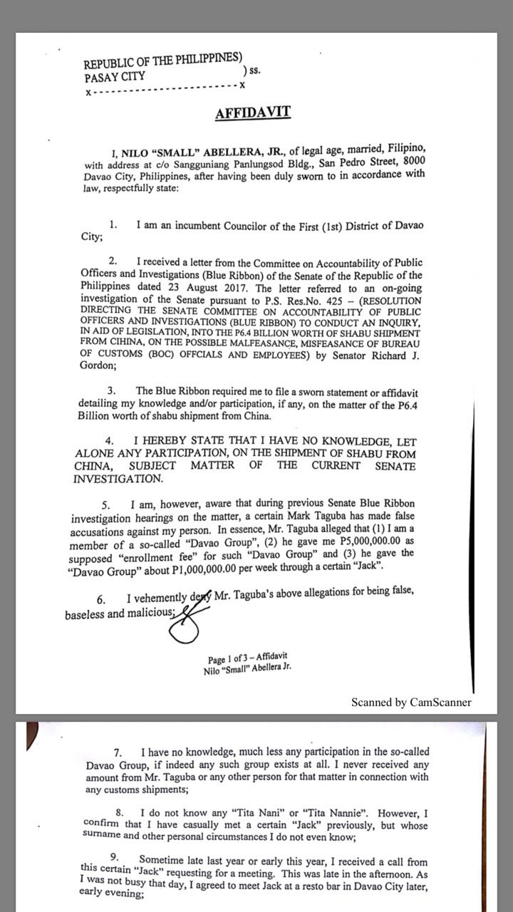 In an affidavit submitted to the Senate blue ribbon committee, Nilo “Small” Abellera said that he “ha(s) no knowledge, let alone any participation (in the entry) of the shabu shipment from China.”