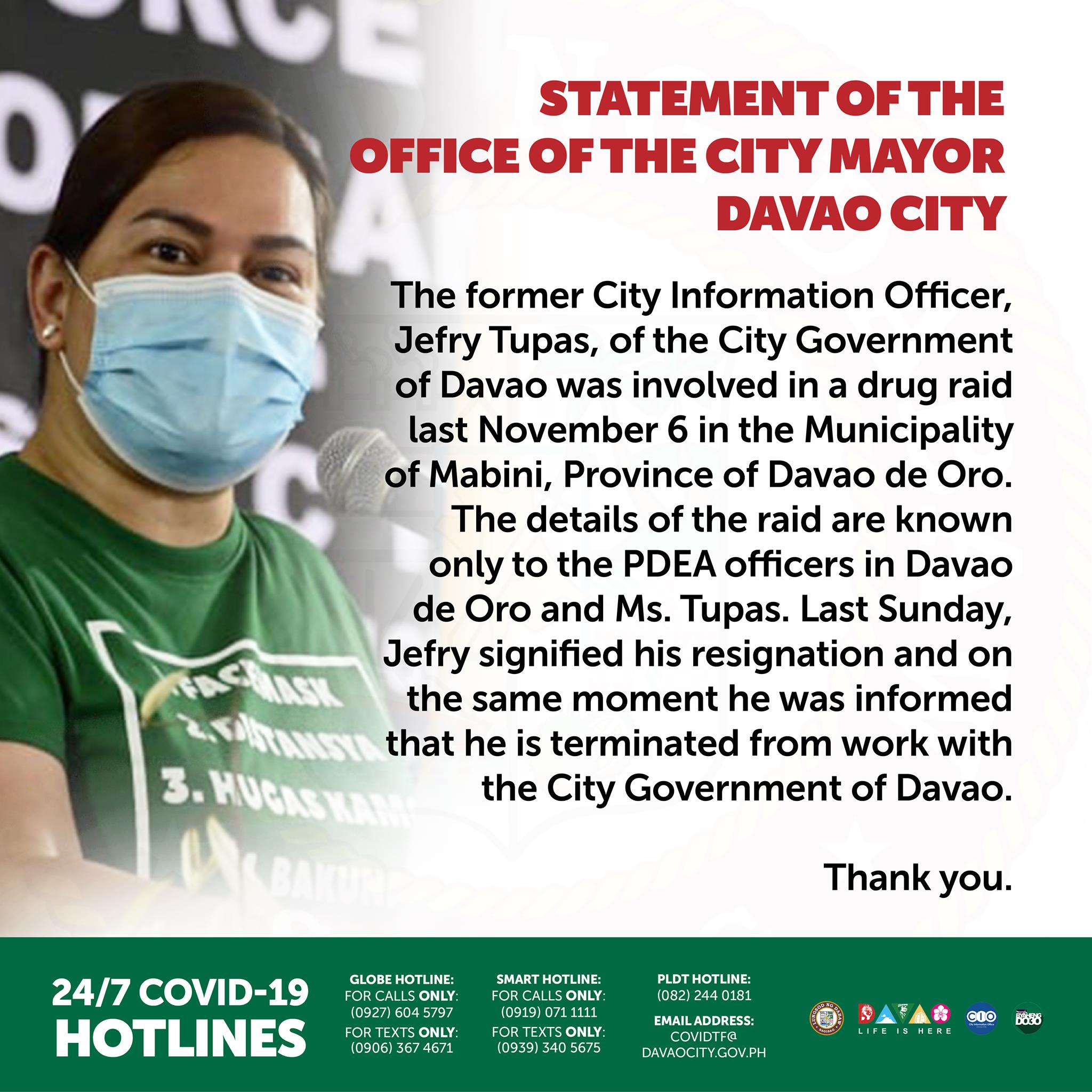 (Eagle News) — Davao Mayor Sara Duterte on Tuesday, Nov. 8, said she fired her city information officer after he attended a party later raided by the Philippine Drug Enforcement Agency on Nov. 6.