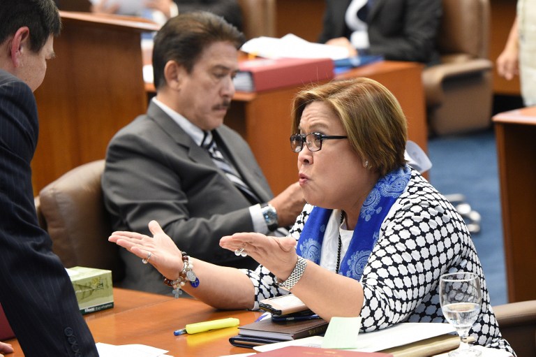 The Philippine government on February 17 filed criminal charges against de Lima, alleging she ran a drug trafficking ring using criminals in the country’s largest prison when she was justice secretary. De Lima said in a statement that the charges, which could land her a 30-year jail term, were solely aimed at silencing her criticism of President Rodrigo Duterte. / AFP PHOTO / TED ALJIBE