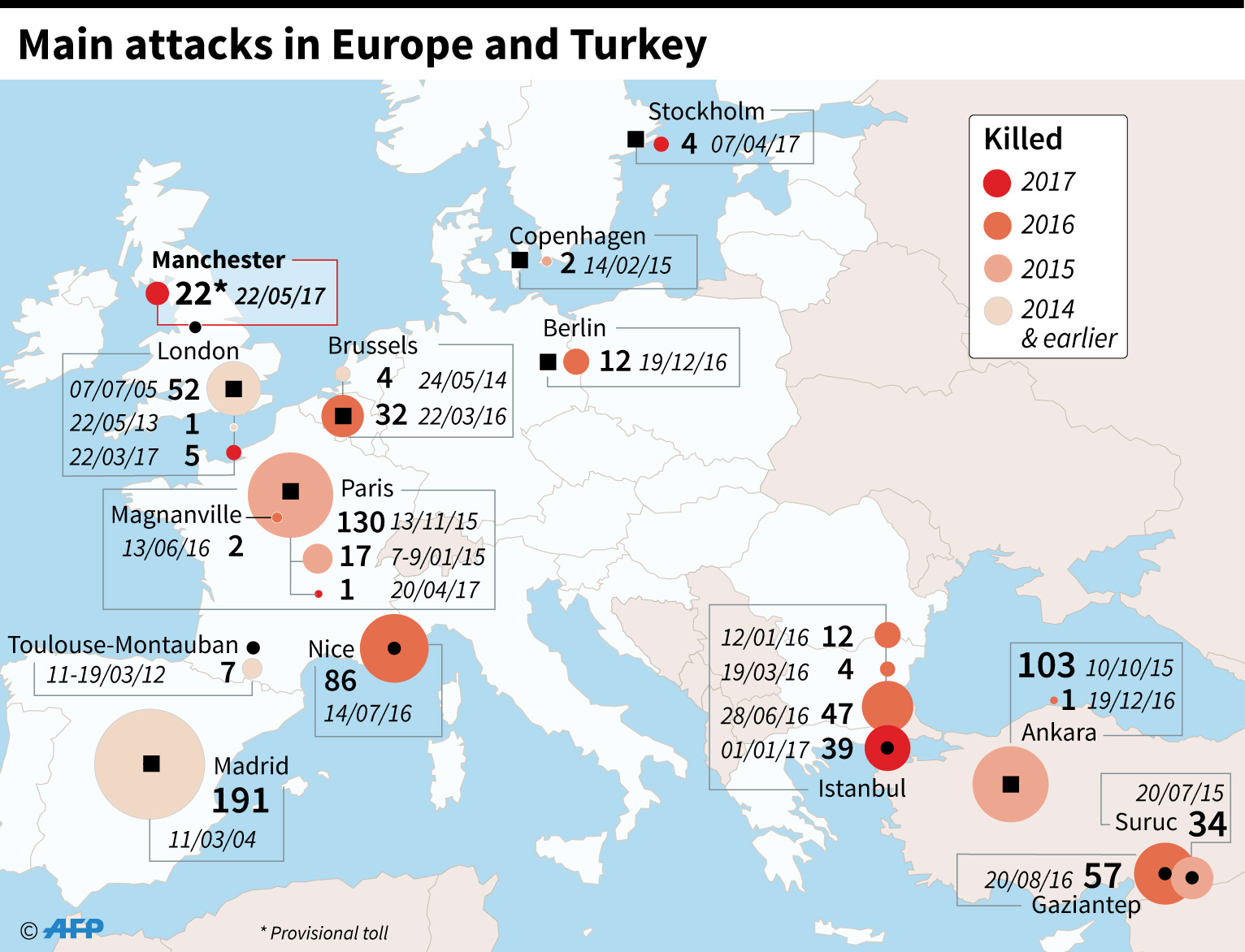 PARIS, France (AFP) – The deadly bombing at a pop concert in the British city of Manchester which killed 22 people including children was the latest attack against targets in Europe, most of them by radical Islamists.