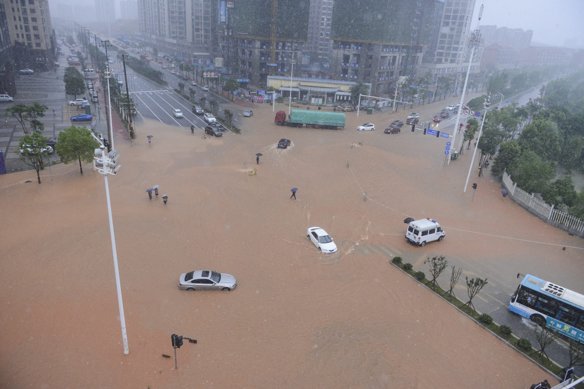 Days of torrential rain in Hunan province raised the water level of the Xiangjiang River to exceed its record flood level. / AFP PHOTO / STR / China OUT