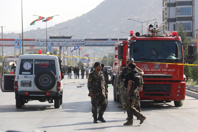 A suicide bomber on a motorbike blew himself up near a convoy of gunmen commemorating the death anniversary of a famed resistance leader in Kabul on September 9, killing at least seven people, officials said. / AFP /