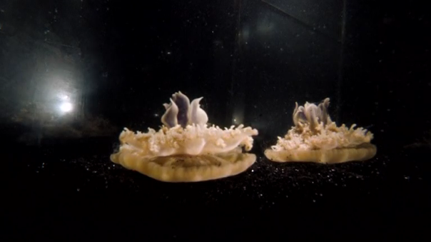 To test the cassiopeas’ response time during their period of decreased activity the Caltech team lifted the jellyfish on a screen higher in the tank and then pulled the screen away. This kind of jellyfish prefer to rest on a surface and in the day time would drop to the bottom of the tank straight away. At night, they floated in the water for up to five seconds before doing this, showing their response time was slower.