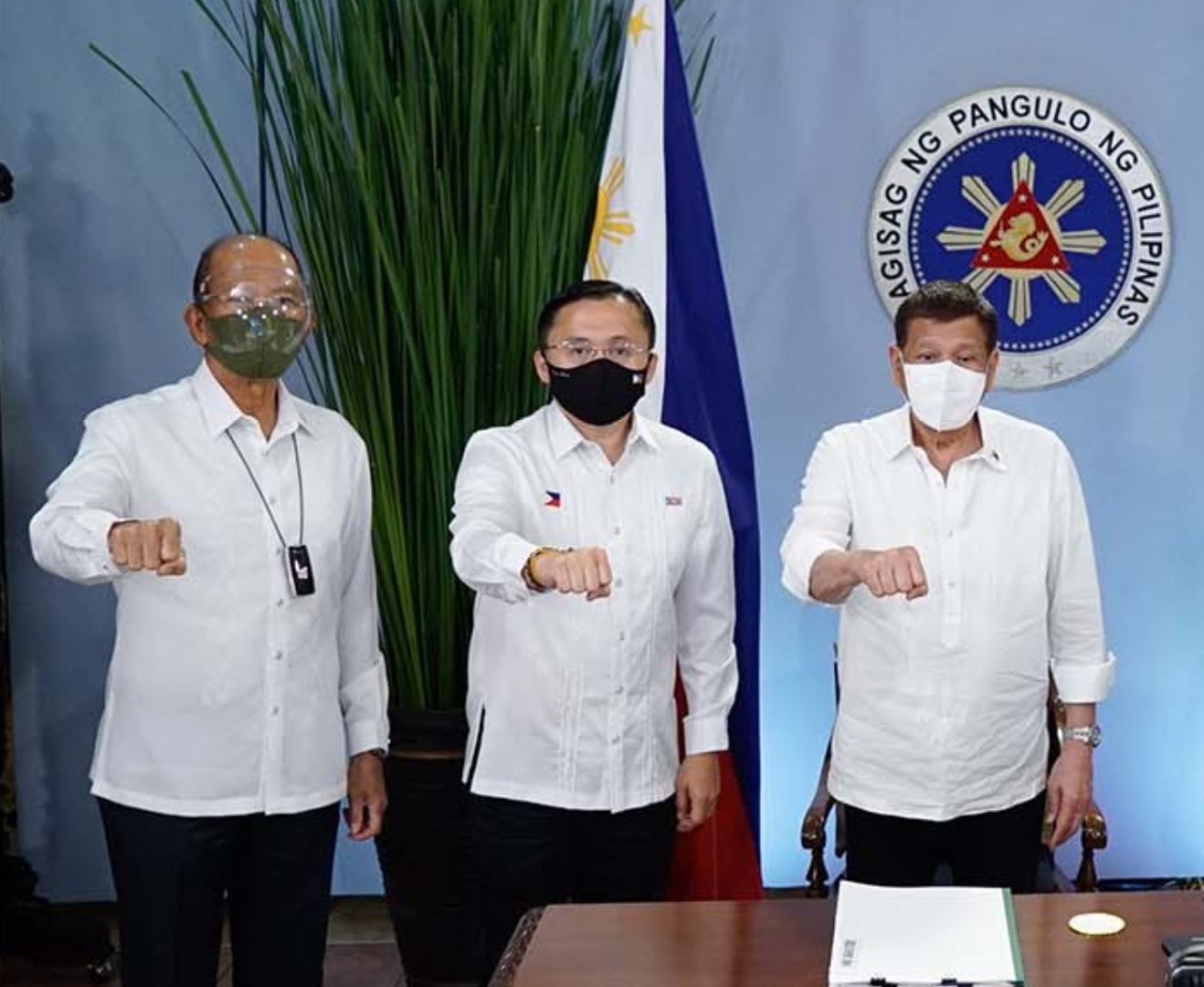 Cropped photo from a Malacanang photo release showing Defense chief Lorenzana making the signature Duterte fist pose along with Senator Christopher “Bong” Go and President Rodrigo Duterte in a meeting of the Inter-Agency Task Force on March 29, 2021 in Malacanang. Other cabinet officials who were also in the original photo (but not shown here) are Health Secretary Francisco Duque III, Presidential Spokesperson Herminio “Harry” Roque Jr., and Presidential Adviser on Peace Process and National Task Force against Coronavirus Disease-2019 (NTF COVID-19) chief implementer Carlito Galvez Jr. (Cropped from Malacanang photo release)